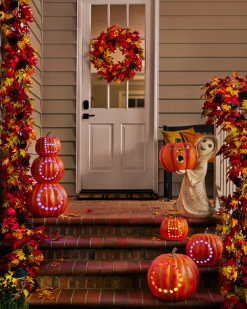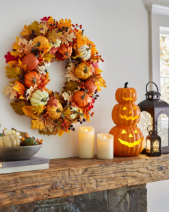 Des citrouilles-lanternes empilées sur une table éclairée FF66453 Balsam Hill décoration délicat