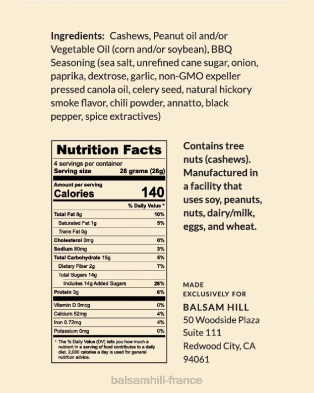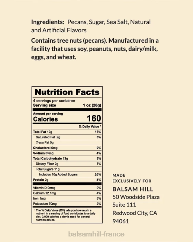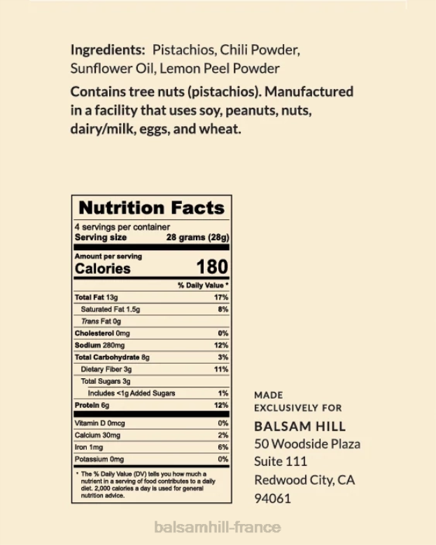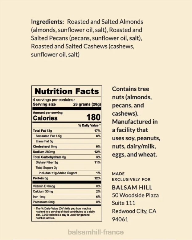 - ingrédients : amandes grillées et salées, noix de pécan grillées et salées, noix de cajou grillées et salées, pistaches, poudre de chili, huile de tournesol, poudre de zeste de citron, sucre, sel, vanille, noix de cajou entières, huile de canola, maltodextrine de maïs, extrait de levure autolysée, arôme, épices, poudre d’oignon, glutamate monosodique, poudre de tomate, poudre d’ail, diacétate de sodium, dioxyde de silicium, arôme de fumée, pacanes, sucre, sel marin, naturel et artificiel saveurs