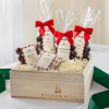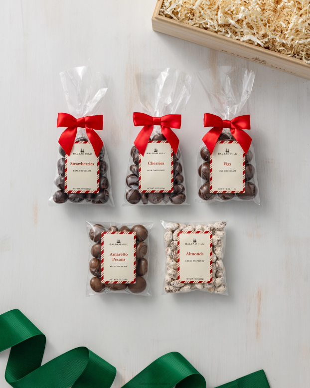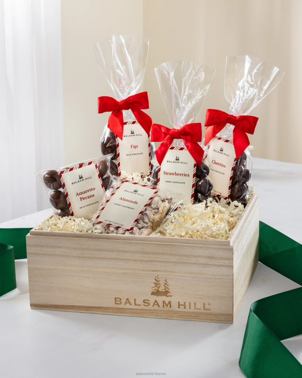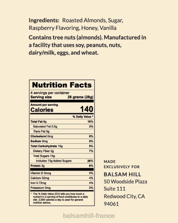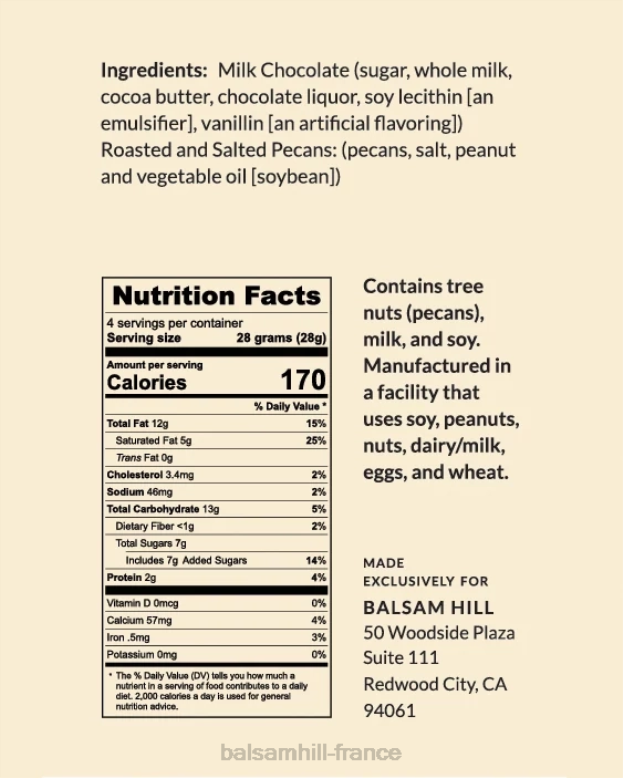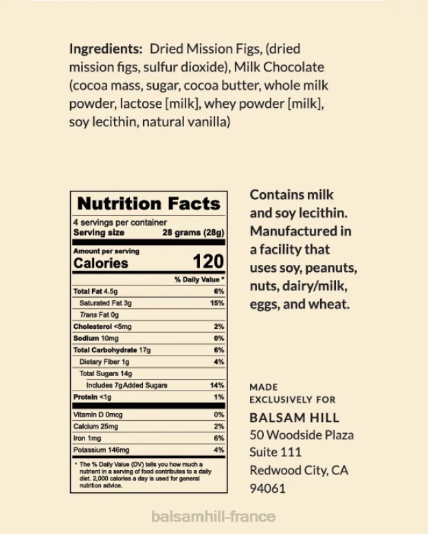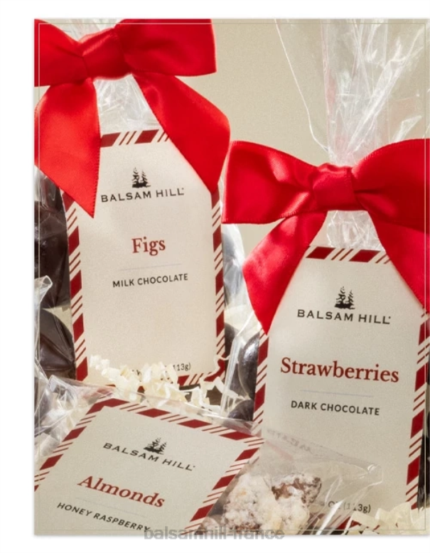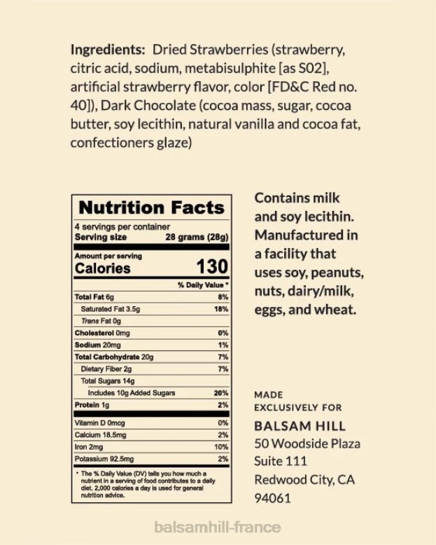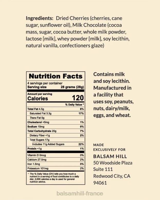 - ingrédients : figues de mission séchées, dioxyde de soufre, chocolat au lait, pâte de cacao, sucre, beurre de cacao, lait entier en poudre, lactose, lactosérum en poudre, lécithine de soja, vanille naturelle, fraises séchées, pâte de cacao au chocolat noir, cerises séchées, noix de pécan grillées salées, amandes grillées, arôme framboise, miel