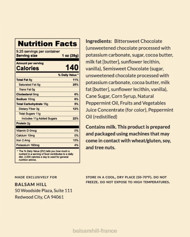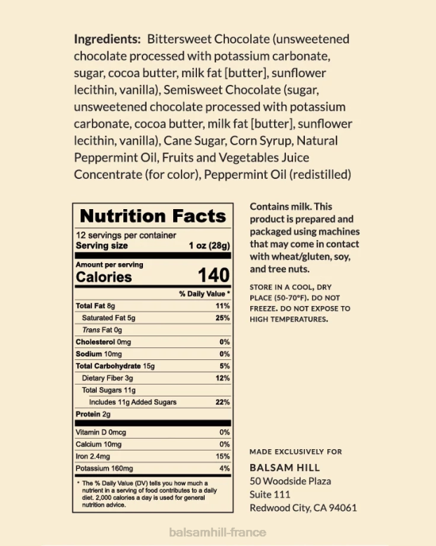 - ingrédients : mi-sucré chocolat, lécithine de tournesol, vanille, chocolat blanc, sucre de canne, sirop de maïs, huile naturelle de menthe poivrée, jus concentré de fruits et légumes