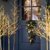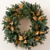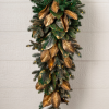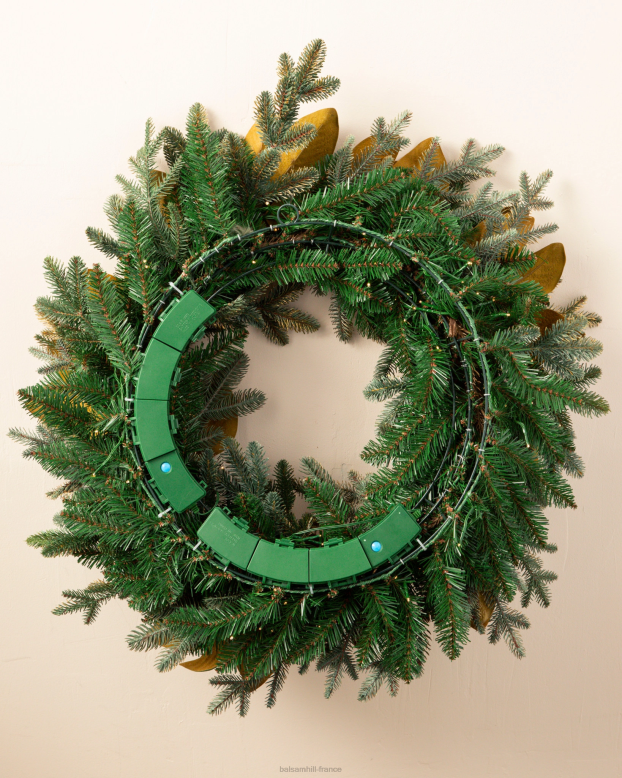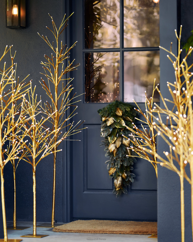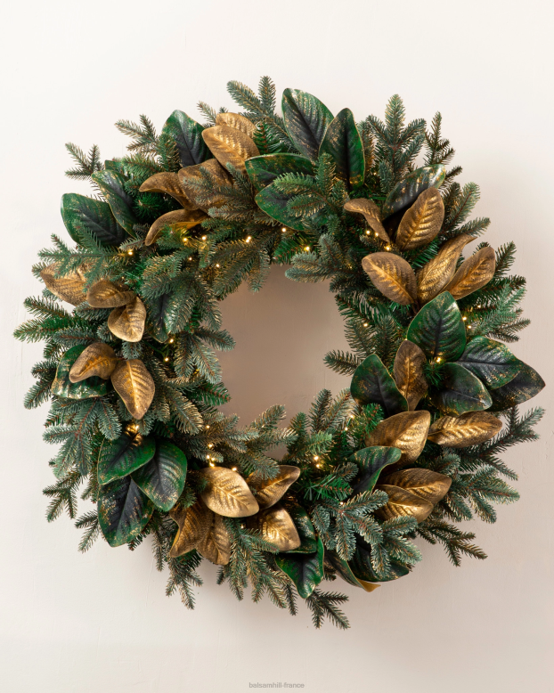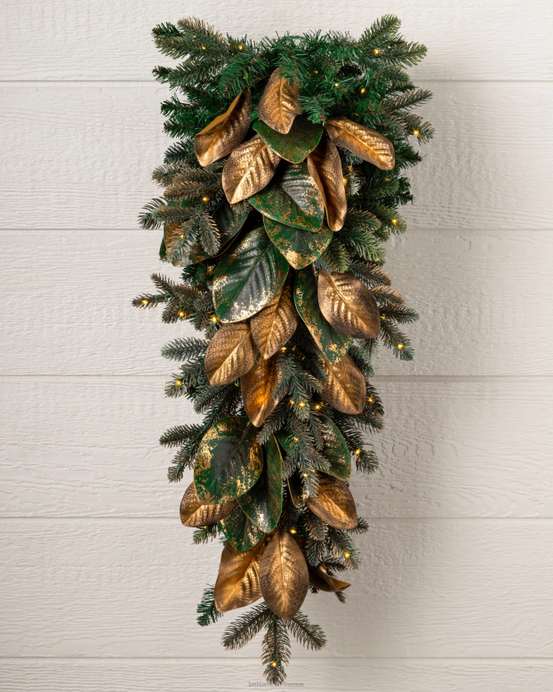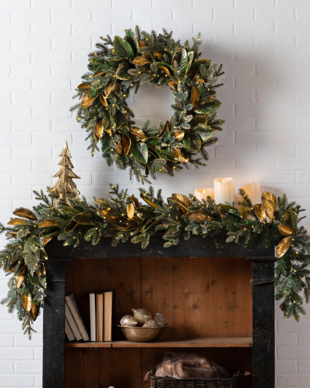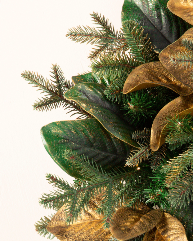 apportez une touche d’élégance boisée à vos espaces de vie. des feuilles de magnolia dorées et de charmantes guirlandes lumineuses créent une scène de vacances enchanteresse.