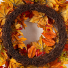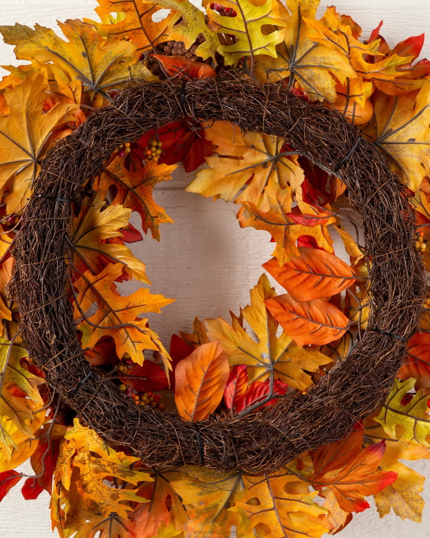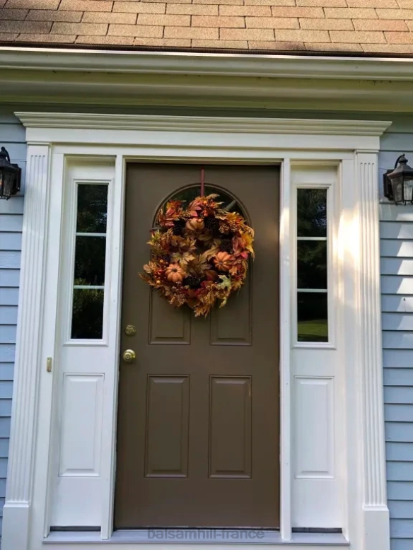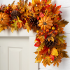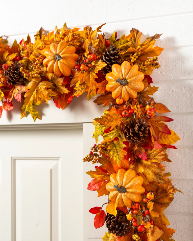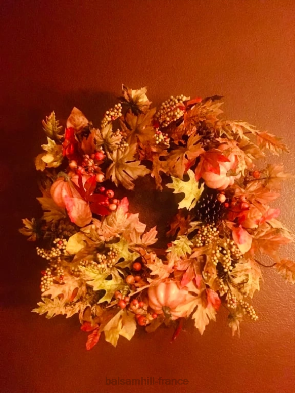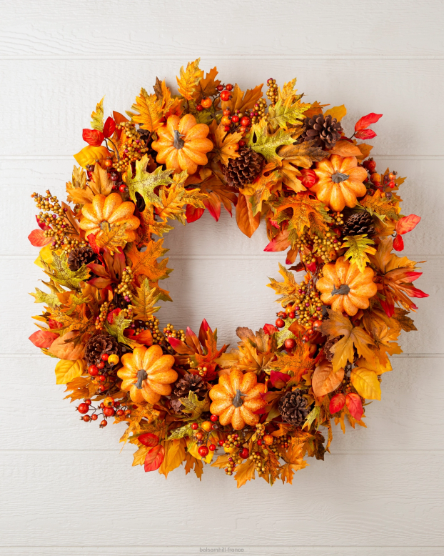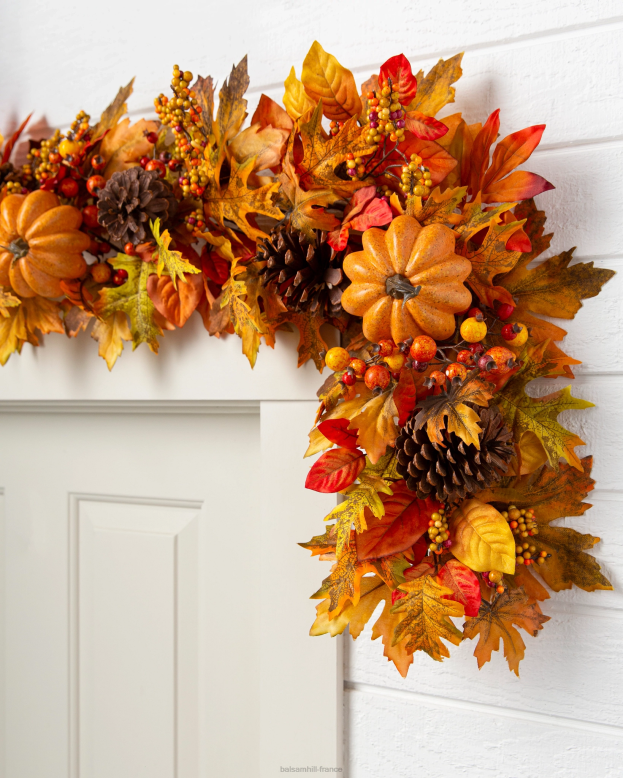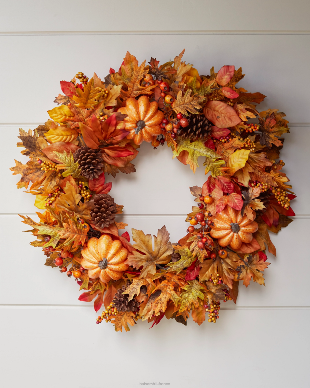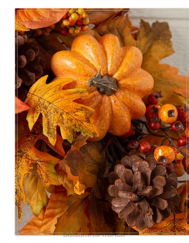 - tous les produits de cette collection présentent une gamme de citrouilles, de pommes de pin, de baies oranges, de petites grappes de baies et un mélange de feuilles de marbre, de chêne, de pivoine et de magnolia