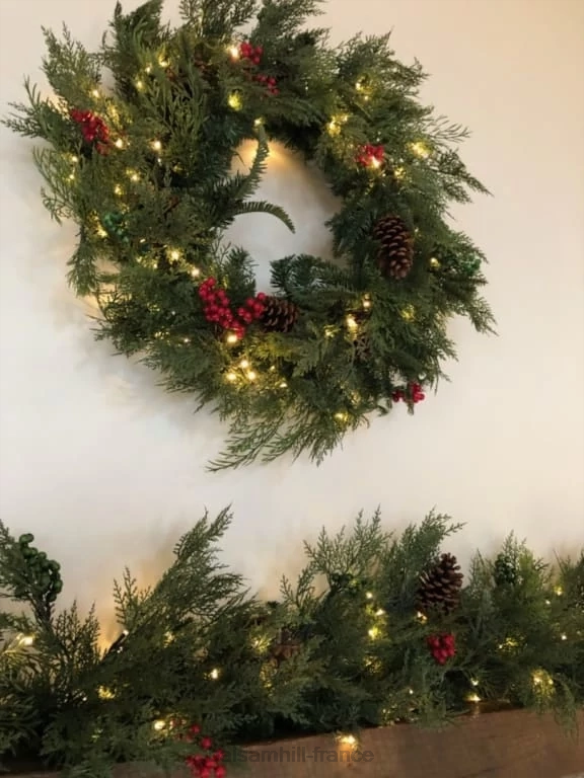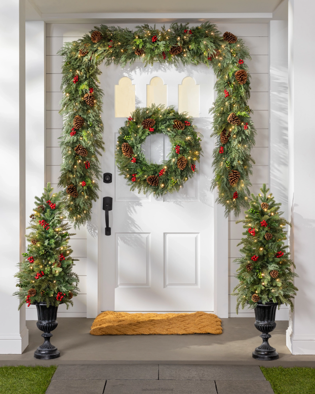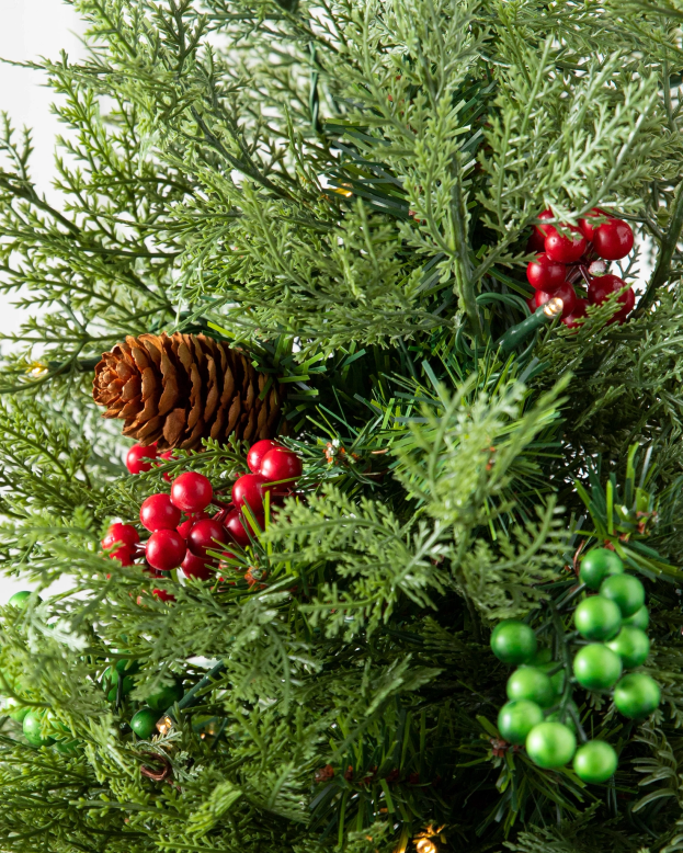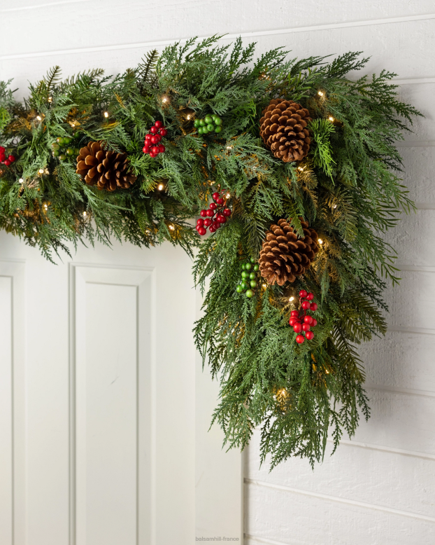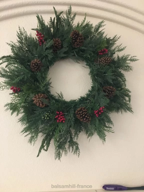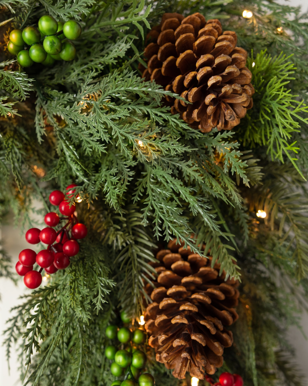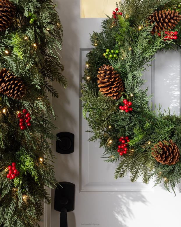- tous les produits de cette collection présentent un mélange de feuillages de cèdre et de sapin réalistes, agrémentés de grappes de baies rouges et vertes et de pommes de pin naturelles.