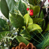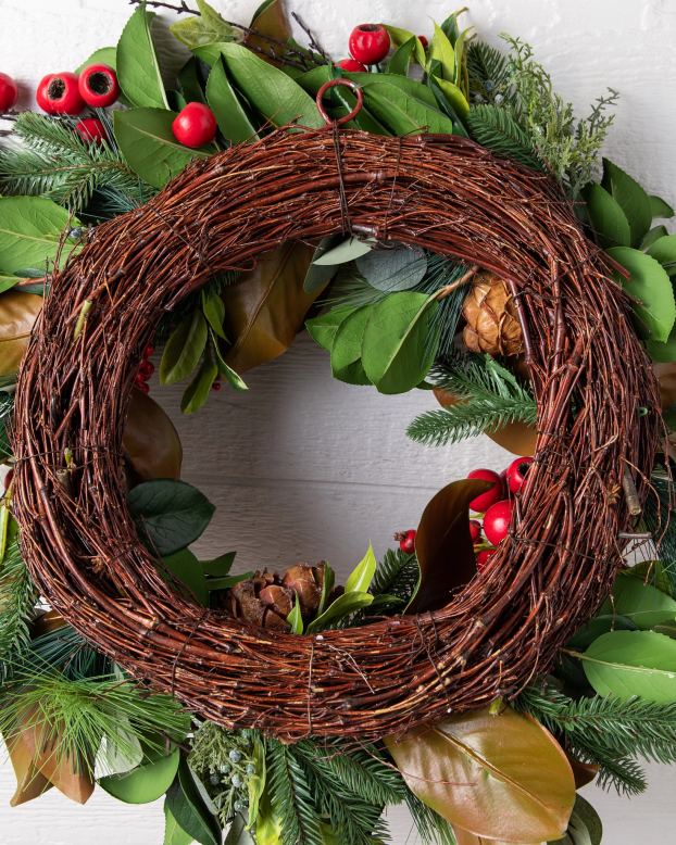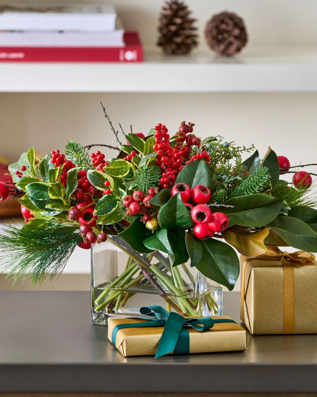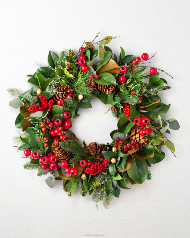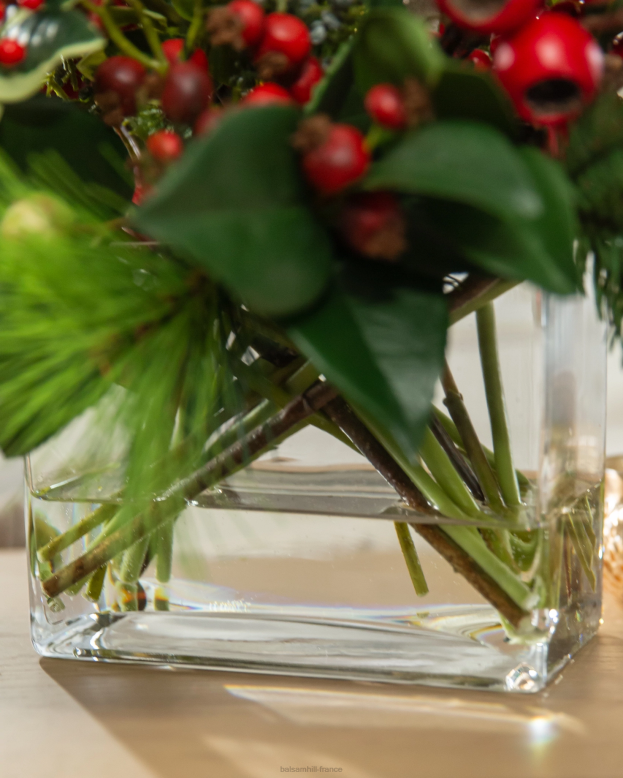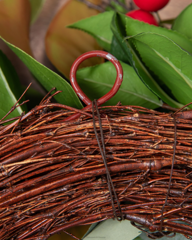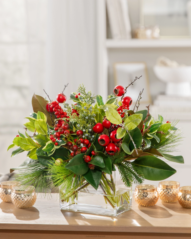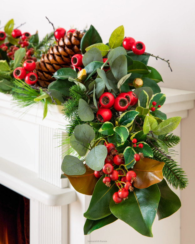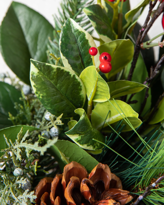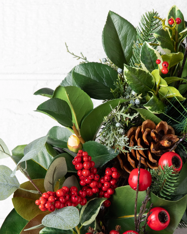 - Tous les produits de cette collection présentent un mélange de feuilles de genévrier et de laurier agrémenté de baies d’hiver et d’églantier