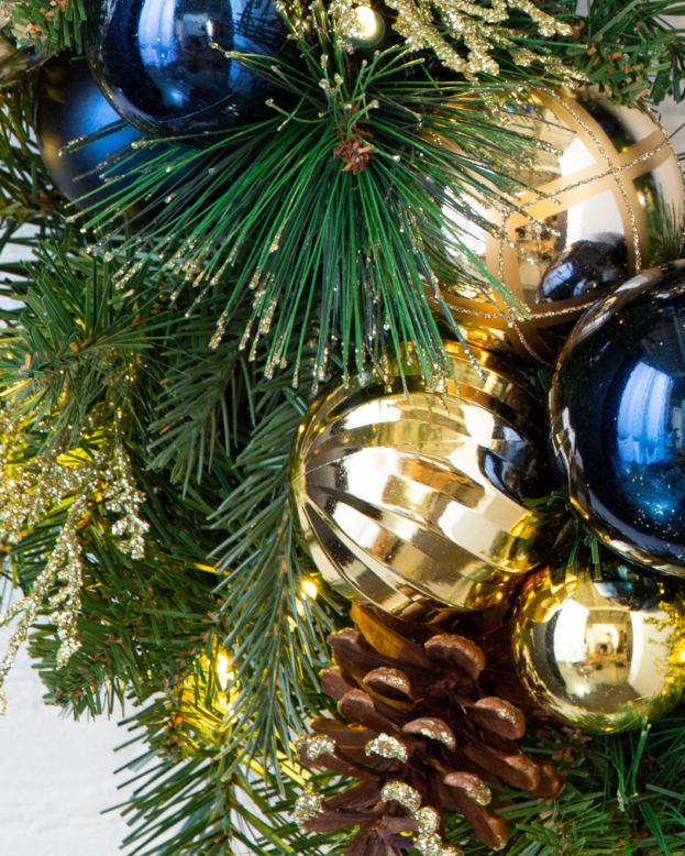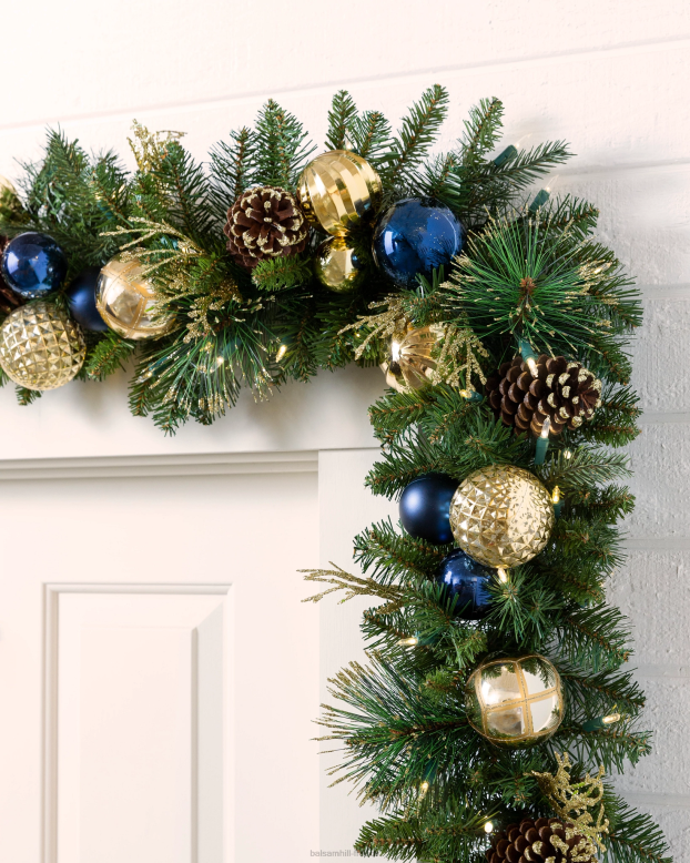 donnez à vos fêtes de fin d’année une touche de luxe avec un feuillage aux pointes dorées et de riches teintes bleues. drapez-vous sur votre cheminée, votre porche ou votre entrée pour un magnifique look orné de bijoux qui reflète l’élégance de Biltmore.