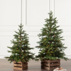 créez un charmant look de ferme avec des mini sapins de Noël. placés dans des caisses en bois, ils constituent un moyen facile d’ajouter une ambiance chaleureuse n’importe où.